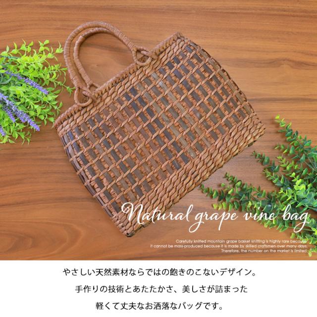 天然山葡萄の蔓(つる)のバッグかごです。山に自生する山葡萄の蔓を贅沢に使用し、熟練の職人さんが手作りで編み上げています。天然素材の丈夫で美しい一生もののバッグです。