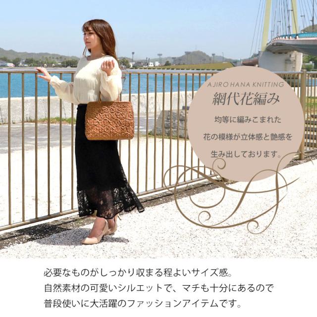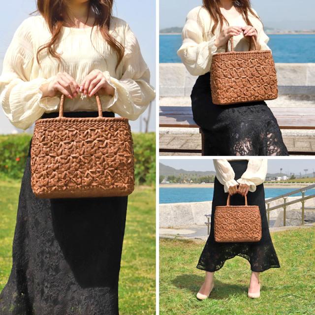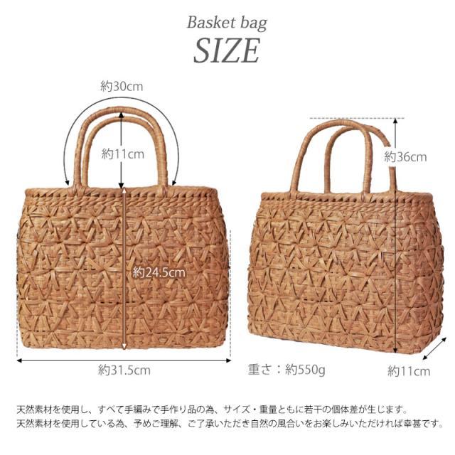 | 仕様 | 網代花編み 固定ハンドル 柿渋染め内布(かぶせ付 内ポケット付き) 取り扱い説明書 保証書付き |