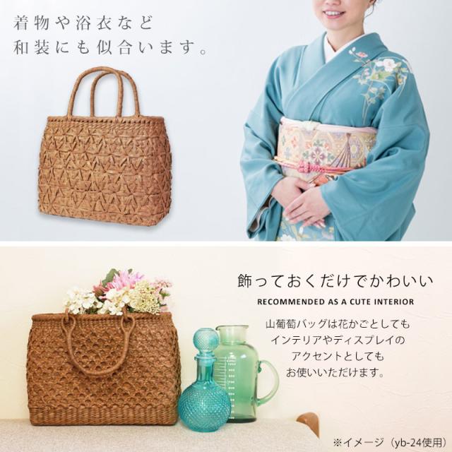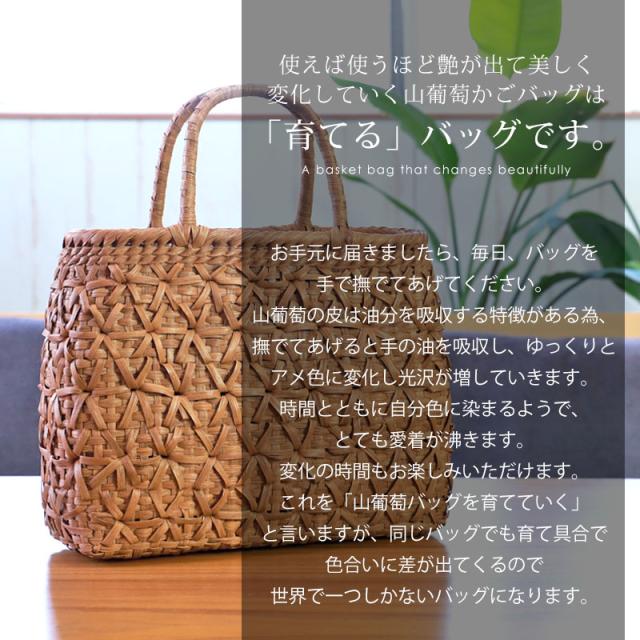 | 商品説明 | 天然山葡萄の蔓(つる)のバッグかごです。山に自生する山葡萄の蔓を贅沢に使用し、熟練の職人さんが手作りで編み上げています。 天然素材の丈夫で美しい一生もののバッグです。 使えば使うほど艶が出て美しく変化していく山葡萄かごバッグは「育てる」バッグです。 必要なものがしっかり収まる程よいサイズ感。自然素材の可愛いシルエットで、マチも十分にあるので普段使いに大活躍のファッションアイテムです。 季節を問わず通年使え、着物にもカジュアルにも似合います。 付属の内布は柿渋染めです。天然素材ならではの温かみのある色合いで、防腐、防虫効果に優れています。柿渋染めは使い込むほどに深みのある色へ変化していきます。 やさしい風合いが山葡萄バックに相性がよろしいです。 お手元に届きましたら、毎日、バッグを手で撫でてあげてください。 山葡萄の皮は油分を吸収する特徴がある為、撫でてあげると手の油を吸収し、ゆっくりとアメ色に変化し光沢が増していきます。 時間とともに自分色に染まるようで、とても愛着が沸きます。変化の時間もお楽しみいただけます。 これを「山葡萄バッグを育てていく」と言いますが、同じバッグでも育て具合で色合いに差が出てくるので世界で一つしかないバッグになります。 <山葡萄バッグができるまで> ・蔓の採取 山葡萄の蔓から取った皮を使い、熟練の職人が丹精込めてひとつひとつ作っています。 人里離れた標高1,000m以上の山奥で昔から寒冷地に自生する植物です。 蔓と言っても太さ10cm以上にもなります。 その蔓を剥ぎ取り乾燥させて、かごバッグの材料となるようサイズを整えていきます。 ・編む 職人が作った木型に合わせて、バッグの底部から編んでいきます。 網目が均等にするには指先の力が強くないと綺麗に仕上げることができません。 最後に細かい毛羽を丁寧に取り除き、かごバッグのできあがりです。 ・技術 丁寧に編み上げられた山葡萄かご編みは、熟練の職人が何日もかけて作り上げていくので大量生産ができず稀少性が高いです。 その為、市場に出回る数も限られています。 ・内布を取り付け ナチュラルでおしゃれな柿渋染めの内布が付いています。天然の柿渋原液を使用し染め上げています。 優しい風合いが山葡萄バックに相性がよろしいです。 内布は縫い付けて固定されていますので、安定した収納ができバッグの中身も安心です。 ・柿渋染めの理由 柿渋には防虫、防カビ、防腐、防臭、消臭などの効果があります。 山葡萄の蔓は正常にご使用、保管していただけば、カビが生えることはありませんが、湿気が多いところで保管すると表面にカビが発生する場合があります。 それを予防目的も兼ねてコストを掛けてでも、山葡萄バッグに柿渋染めの内布を取り付けています。 <山葡萄かごバッグの選び方> 初めて憧れの山葡萄バッグを持つ方は、定番の「網代編み」がとても人気です。 2個目、3個目を購入する方は「六角花編み」や「サイズ違い」をお選びいただく場合が多いです。 山葡萄チャームやお財布もございます。 職人が丁寧に編み上げた籠バッグは世代を超え永く愛することができます。 年月を重ねるほど深みを増す色合いと艶を楽しめる山葡萄シリーズは、母の日や誕生日プレゼントなどの贈り物としても大変喜ばれる逸品です。 長年、時間を共にしたバッグはなんとも言えない艶に輝き、しなやかさも合わせ持ち、手放せないものになる一生ものです。 編み方がおしゃれな山葡萄バッグは花かごとしてもインテリアやディスプレイのアクセントとしてもお使いいただけます。 自然素材をお楽しみください 天然素材を使用し、すべて手編みで手作り品の為、サイズ・重量ともに若干の個体差が生じます。 自然素材特有のささくれ、割れ、色ムラが生じる場合がございます。 ささくれや色ムラ等は、使い込むうちに自然と馴染み、風合いよくなめらかになっていきます。 天然素材を使用している為、予めご理解、ご了承いただき自然の風合いをお楽しみいただければ幸甚です。 |