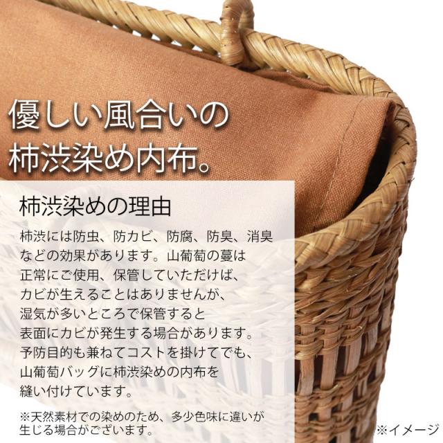 付属の内布は柿渋染めです。天然素材ならではの温かみのある色合いで、防腐、防虫効果に優れています。柿渋染めは使い込むほどに深みのある色へ変化していきます。やさしい風合いが山葡萄バックに相性がよろしいです。山葡萄 かごバッグ 1年保証付き 内布付き 山ぶどう やまぶどう 蔓 天然素材 カゴバッグ 籠バッグ バスケット レディース 大人 おしゃれ 綺麗 網代花編み 固定ハンドル 手提げ B5 ハンドメイド 手作り 母の日