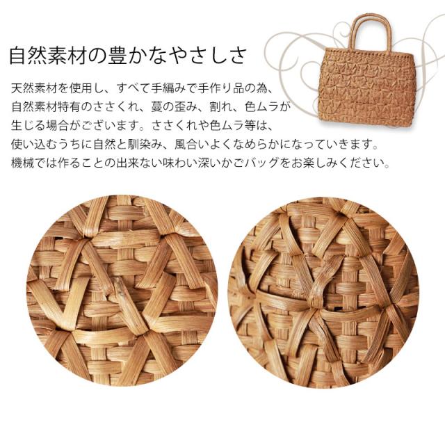 | ご購入に関するご注意 | ・天然素材を使用し、すべて手編みで手作り品の為、サイズ・重量ともに若干の個体差が生じます。 また、自然素材特有のささくれ、蔓の歪み、割れ、色ムラが生じる場合がございます。 ささくれや色ムラ等は、使い込むうちに自然と馴染み、風合いよくなめらかになっていきます。 ・内布もまた天然素材での染めのため、多少色味に違いが生じる場合がございます。 天然素材を使用している為、予めご理解、ご了承いただき自然の風合いをお楽しみいただければ幸甚です。 ・モニター・ディスプレイによっても写り方が変ります。 予めご了承くださいませ。 |