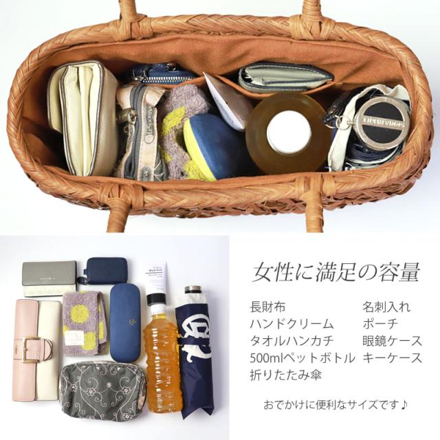 必要なものがしっかり収まる程よいサイズ感。自然素材の可愛いシルエットで、マチも十分にあるので普段使いに大活躍のファッションアイテムです。季節を問わず通年使え、着物にもカジュアルにも似合います。