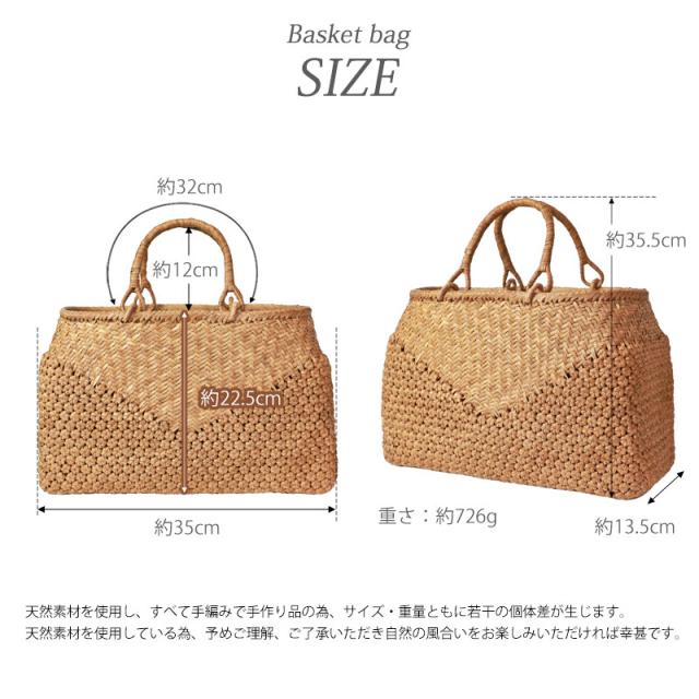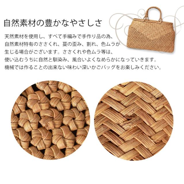 | ご購入に関するご注意 | ・天然素材を使用し、すべて手編みで手作り品の為、サイズ・重量ともに若干の個体差が生じます。 また、自然素材特有のささくれ、蔓の歪み、割れ、色ムラが生じる場合がございます。 ささくれや色ムラ等は、使い込むうちに自然と馴染み、風合いよくなめらかになっていきます。 ・内布もまた天然素材での染めのため、多少色味に違いが生じる場合がございます。 天然素材を使用している為、予めご理解、ご了承いただき自然の風合いをお楽しみいただければ幸甚です。 ・モニター・ディスプレイによっても写り方が変ります。 予めご了承くださいませ。 |