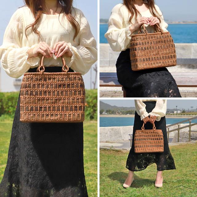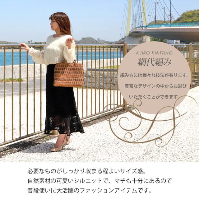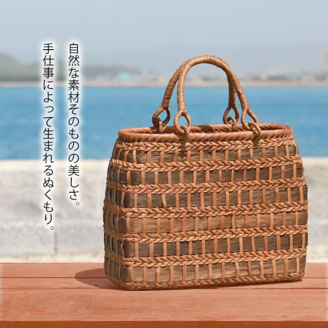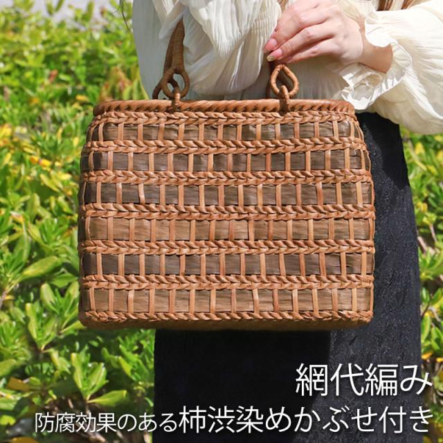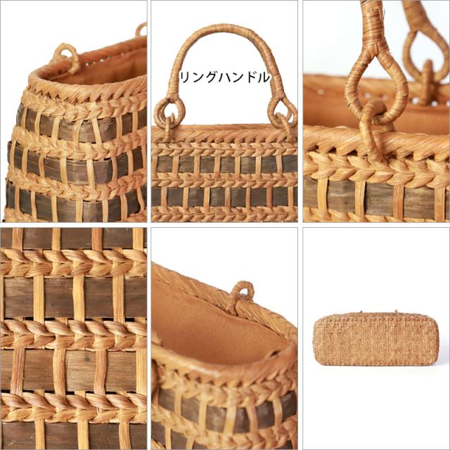 | 仕様 | 網代編み リングハンドル 柿渋染め内布(かぶせ付 内ポケット付き) 取り扱い説明書 保証書付き |