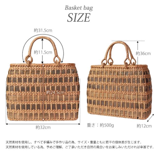 | ご購入に関するご注意 | ・天然素材を使用し、すべて手編みで手作り品の為、サイズ・重量ともに若干の個体差が生じます。 また、自然素材特有のささくれ、蔓の歪み、割れ、色ムラが生じる場合がございます。 ささくれや色ムラ等は、使い込むうちに自然と馴染み、風合いよくなめらかになっていきます。 ・内布もまた天然素材での染めのため、多少色味に違いが生じる場合がございます。 天然素材を使用している為、予めご理解、ご了承いただき自然の風合いをお楽しみいただければ幸甚です。 ・モニター・ディスプレイによっても写り方が変ります。 予めご了承くださいませ。 |
