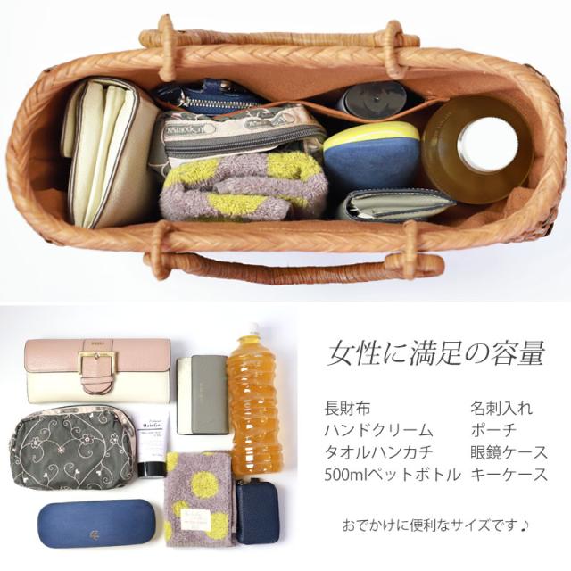 必要なものがしっかり収まる程よいサイズ感。自然素材の可愛いシルエットで、マチも十分にあるので普段使いに大活躍のファッションアイテムです。季節を問わず通年使え、着物にもカジュアルにも似合います。