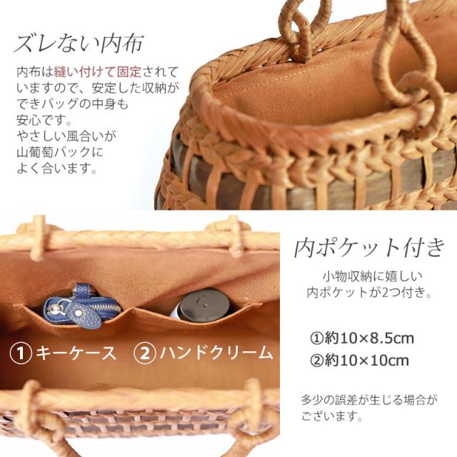 | 素材 | 鞄本体:天然山葡萄蔓 内布:綿100%(柿渋染め) |