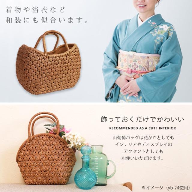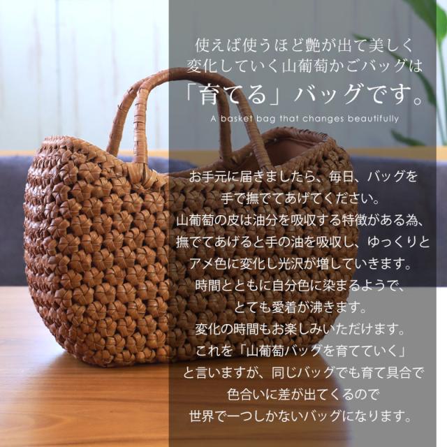 | 商品説明 | 天然山葡萄の蔓(つる)のバッグかごです。山に自生する山葡萄の蔓を贅沢に使用し、熟練の職人さんが手作りで編み上げています。 天然素材の丈夫で美しい一生もののバッグです。 使えば使うほど艶が出て美しく変化していく山葡萄かごバッグは「育てる」バッグです。 必要なものがしっかり収まる程よいサイズ感。自然素材の可愛いシルエットで、マチも十分にあるので普段使いに大活躍のファッションアイテムです。 季節を問わず通年使え、着物にもカジュアルにも似合います。 付属の内布は柿渋染めです。天然素材ならではの温かみのある色合いで、防腐、防虫効果に優れています。柿渋染めは使い込むほどに深みのある色へ変化していきます。 やさしい風合いが山葡萄バックに相性がよろしいです。 お手元に届きましたら、毎日、バッグを手で撫でてあげてください。 山葡萄の皮は油分を吸収する特徴がある為、撫でてあげると手の油を吸収し、ゆっくりとアメ色に変化し光沢が増していきます。 時間とともに自分色に染まるようで、とても愛着が沸きます。変化の時間もお楽しみいただけます。 これを「山葡萄バッグを育てていく」と言いますが、同じバッグでも育て具合で色合いに差が出てくるので世界で一つしかないバッグになります。 <山葡萄バッグができるまで> ・蔓の採取 山葡萄の蔓から取った皮を使い、熟練の職人が丹精込めてひとつひとつ作っています。 人里離れた標高1,000m以上の山奥で昔から寒冷地に自生する植物です。 蔓と言っても太さ10cm以上にもなります。 その蔓を剥ぎ取り乾燥させて、かごバッグの材料となるようサイズを整えていきます。 ・編む 職人が作った木型に合わせて、バッグの底部から編んでいきます。 網目が均等にするには指先の力が強くないと綺麗に仕上げることができません。 最後に細かい毛羽を丁寧に取り除き、かごバッグのできあがりです。 ・技術 丁寧に編み上げられた山葡萄かご編みは、熟練の職人が何日もかけて作り上げていくので大量生産ができず稀少性が高いです。 その為、市場に出回る数も限られています。 ・内布を取り付け ナチュラルでおしゃれな柿渋染めの内布が付いています。天然の柿渋原液を使用し染め上げています。 優しい風合いが山葡萄バックに相性がよろしいです。 内布は縫い付けて固定されていますので、安定した収納ができバッグの中身も安心です。 ・柿渋染めの理由 柿渋には防虫、防カビ、防腐、防臭、消臭などの効果があります。 山葡萄の蔓は正常にご使用、保管していただけば、カビが生えることはありませんが、湿気が多いところで保管すると表面にカビが発生する場合があります。 それを予防目的も兼ねてコストを掛けてでも、山葡萄バッグに柿渋染めの内布を取り付けています。 <山葡萄かごバッグの選び方> 初めて憧れの山葡萄バッグを持つ方は、定番の「網代編み」がとても人気です。 2個目、3個目を購入する方は「六角花編み」や「サイズ違い」をお選びいただく場合が多いです。 山葡萄チャームやお財布もございます。 職人が丁寧に編み上げた籠バッグは世代を超え永く愛することができます。 年月を重ねるほど深みを増す色合いと艶を楽しめる山葡萄シリーズは、母の日や誕生日プレゼントなどの贈り物としても大変喜ばれる逸品です。 長年、時間を共にしたバッグはなんとも言えない艶に輝き、しなやかさも合わせ持ち、手放せないものになる一生ものです。 編み方がおしゃれな山葡萄バッグは花かごとしてもインテリアやディスプレイのアクセントとしてもお使いいただけます。 自然素材をお楽しみください 天然素材を使用し、すべて手編みで手作り品の為、サイズ・重量ともに若干の個体差が生じます。 自然素材特有のささくれ、割れ、色ムラが生じる場合がございます。 ささくれや色ムラ等は、使い込むうちに自然と馴染み、風合いよくなめらかになっていきます。 天然素材を使用している為、予めご理解、ご了承いただき自然の風合いをお楽しみいただければ幸甚です。 |