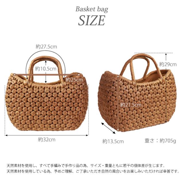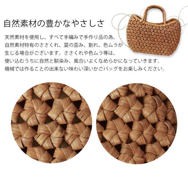 | ご購入に関するご注意 | ・天然素材を使用し、すべて手編みで手作り品の為、サイズ・重量ともに若干の個体差が生じます。 また、自然素材特有のささくれ、蔓の歪み、割れ、色ムラが生じる場合がございます。 ささくれや色ムラ等は、使い込むうちに自然と馴染み、風合いよくなめらかになっていきます。 ・内布もまた天然素材での染めのため、多少色味に違いが生じる場合がございます。 天然素材を使用している為、予めご理解、ご了承いただき自然の風合いをお楽しみいただければ幸甚です。 ・モニター・ディスプレイによっても写り方が変ります。 予めご了承くださいませ。 |