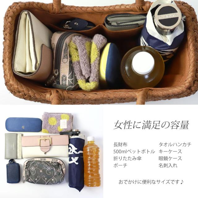 必要なものがしっかり収まる程よいサイズ感。自然素材の可愛いシルエットで、マチも十分にあるので普段使いに大活躍のファッションアイテムです。季節を問わず通年使え、着物にもカジュアルにも似合います。