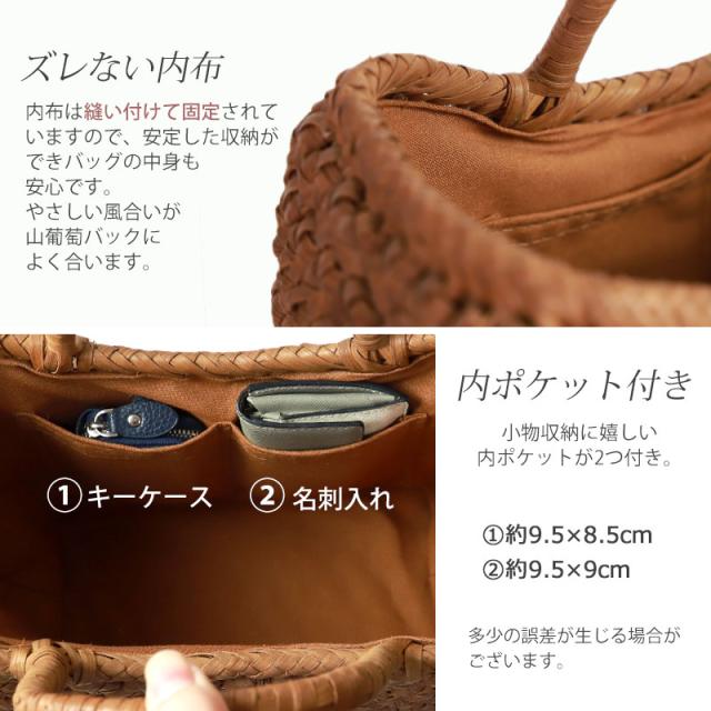 | 素材 | 鞄本体:天然山葡萄蔓 内布:綿100%(柿渋染め) |