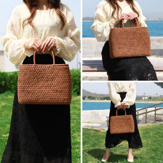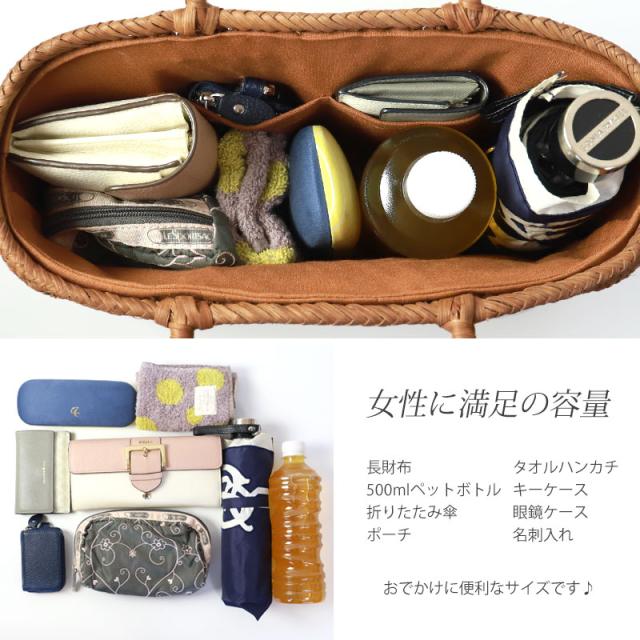 必要なものがしっかり収まる程よいサイズ感。自然素材の可愛いシルエットで、マチも十分にあるので普段使いに大活躍のファッションアイテムです。季節を問わず通年使え、着物にもカジュアルにも似合います。