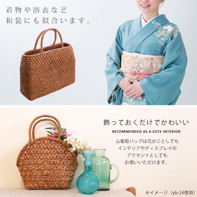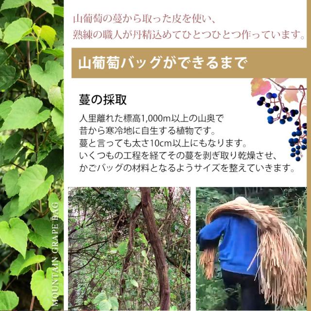 天然山葡萄の蔓(つる)のバッグかごです。山に自生する山葡萄の蔓を贅沢に使用し、熟練の職人さんが手作りで編み上げています。 天然素材の丈夫で美しい一生もののバッグです。 使えば使うほど艶が出て美しく変化していく山葡萄かごバッグは「育てる」バッグです。 必要なものがしっかり収まる程よいサイズ感。自然素材の可愛いシルエットで、マチも十分にあるので普段使いに大活躍のファッションアイテムです。 季節を問わず通年使え、着物にもカジュアルにも似合います。 付属の内布は柿渋染めです。天然素材ならではの温かみのある色合いで、防腐、防虫効果に優れています。柿渋染めは使い込むほどに深みのある色へ変化していきます。 やさしい風合いが山葡萄バックに相性がよろしいです。 お手元に届きましたら、毎日、バッグを手で撫でてあげてください。 山葡萄の皮は油分を吸収する特徴がある為、撫でてあげると手の油を吸収し、ゆっくりとアメ色に変化し光沢が増していきます。 時間とともに自分色に染まるようで、とても愛着が沸きます。変化の時間もお楽しみいただけます。 これを「山葡萄バッグを育てていく」と言いますが、同じバッグでも育て具合で色合いに差が出てくるので世界で一つしかないバッグになります。 <山葡萄バッグができるまで> ・蔓の採取 山葡萄の蔓から取った皮を使い、熟練の職人が丹精込めてひとつひとつ作っています。 人里離れた標高1,000m以上の山奥で昔から寒冷地に自生する植物です。 蔓と言っても太さ10cm以上にもなります。 その蔓を剥ぎ取り乾燥させて、かごバッグの材料となるようサイズを整えていきます。 ・編む 職人が作った木型に合わせて、バッグの底部から編んでいきます。 網目が均等にするには指先の力が強くないと綺麗に仕上げることができません。 最後に細かい毛羽を丁寧に取り除き、かごバッグのできあがりです。 ・技術 丁寧に編み上げられた山葡萄かご編みは、熟練の職人が何日もかけて作り上げていくので大量生産ができず稀少性が高いです。 その為、市場に出回る数も限られています。 ・内布を取り付け ナチュラルでおしゃれな柿渋染めの内布が付いています。天然の柿渋原液を使用し染め上げています。 優しい風合いが山葡萄バックに相性がよろしいです。 内布は縫い付けて固定されていますので、安定した収納ができバッグの中身も安心です。 ・柿渋染めの理由 柿渋には防虫、防カビ、防腐、防臭、消臭などの効果があります。 山葡萄の蔓は正常にご使用、保管していただけば、カビが生えることはありませんが、湿気が多いところで保管すると表面にカビが発生する場合があります。 それを予防目的も兼ねてコストを掛けてでも、山葡萄バッグに柿渋染めの内布を取り付けています。 <山葡萄かごバッグの選び方> 初めて憧れの山葡萄バッグを持つ方は、定番の「網代編み」がとても人気です。 2個目、3個目を購入する方は「六角花編み」や「サイズ違い」をお選びいただく場合が多いです。 山葡萄チャームやお財布もございます。 職人が丁寧に編み上げた籠バッグは世代を超え永く愛することができます。 年月を重ねるほど深みを増す色合いと艶を楽しめる山葡萄シリーズは、母の日や誕生日プレゼントなどの贈り物としても大変喜ばれる逸品です。 長年、時間を共にしたバッグはなんとも言えない艶に輝き、しなやかさも合わせ持ち、手放せないものになる一生ものです。 編み方がおしゃれな山葡萄バッグは花かごとしてもインテリアやディスプレイのアクセントとしてもお使いいただけます。 自然素材をお楽しみください 天然素材を使用し、すべて手編みで手作り品の為、サイズ・重量ともに若干の個体差が生じます。 自然素材特有のささくれ、割れ、色ムラが生じる場合がございます。 ささくれや色ムラ等は、使い込むうちに自然と馴染み、風合いよくなめらかになっていきます。 天然素材を使用している為、予めご理解、ご了承いただき自然の風合いをお楽しみいただければ幸甚です。 |