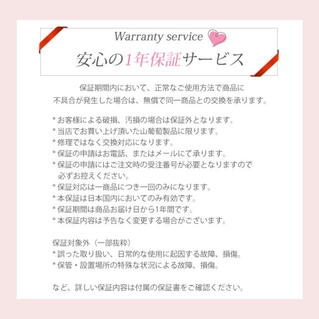 万一、正常なご使用で故障、不具合が発生した場合、責任をもって無償で交換対応させていただきます。 <保証内容> 保証期間内において、正常なご使用方法で商品に不具合が発生した場合は、無償で同一商品との交換を承ります。 *お客様による破損、汚損の場合は保証外となります。 *当店でお買い上げ頂いた山葡萄製品に限ります。 *修理ではなく交換対応になります。 *保証の申請はお電話、またはメールにて承ります。 *保証の申請にはご注文時の受注番号が必要となりますので必ずお控えください。 *保証対応は一商品につき一回のみになります。 *本保証は日本国内においてのみ有効です。 *保証期間は商品発送から1年間です。 *本保証内容は予告なく変更する場合がございます。 |