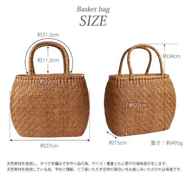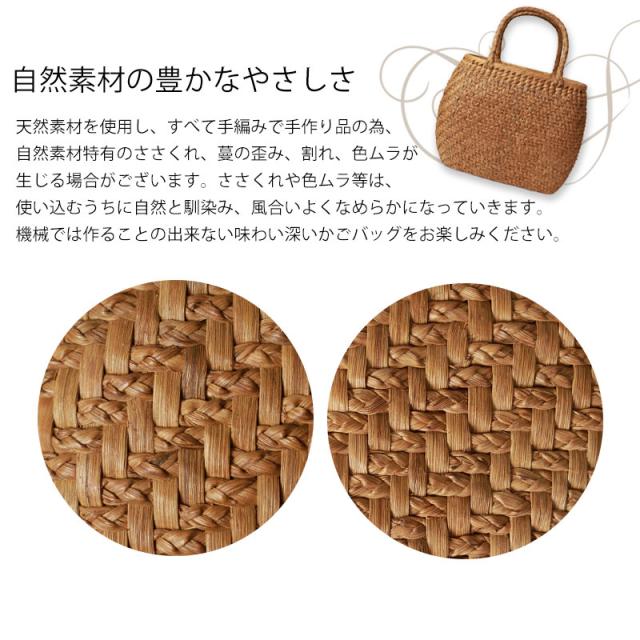 | ご購入に関するご注意 | ・天然素材を使用し、すべて手編みで手作り品の為、サイズ・重量ともに若干の個体差が生じます。 また、自然素材特有のささくれ、蔓の歪み、割れ、色ムラが生じる場合がございます。 ささくれや色ムラ等は、使い込むうちに自然と馴染み、風合いよくなめらかになっていきます。 ・内布もまた天然素材での染めのため、多少色味に違いが生じる場合がございます。 天然素材を使用している為、予めご理解、ご了承いただき自然の風合いをお楽しみいただければ幸甚です。 ・モニター・ディスプレイによっても写り方が変ります。 予めご了承くださいませ。 |
