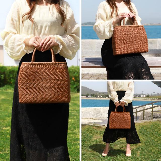 必要なものがしっかり収まる程よいサイズ感。自然素材の可愛いシルエットで、マチも十分にあるので普段使いに大活躍のファッションアイテムです。季節を問わず通年使え、着物にもカジュアルにも似合います。