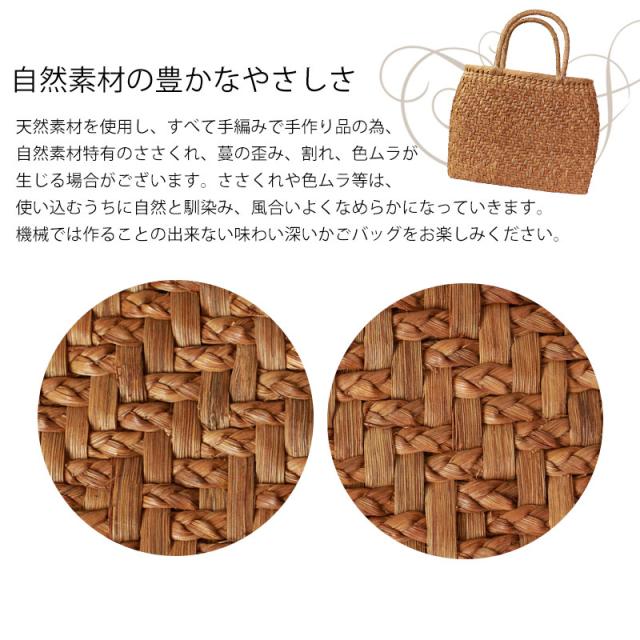 | ご購入に関するご注意 | ・天然素材を使用し、すべて手編みで手作り品の為、サイズ・重量ともに若干の個体差が生じます。 また、自然素材特有のささくれ、蔓の歪み、割れ、色ムラが生じる場合がございます。 ささくれや色ムラ等は、使い込むうちに自然と馴染み、風合いよくなめらかになっていきます。 ・内布もまた天然素材での染めのため、多少色味に違いが生じる場合がございます。 天然素材を使用している為、予めご理解、ご了承いただき自然の風合いをお楽しみいただければ幸甚です。 ・モニター・ディスプレイによっても写り方が変ります。 予めご了承くださいませ。 |