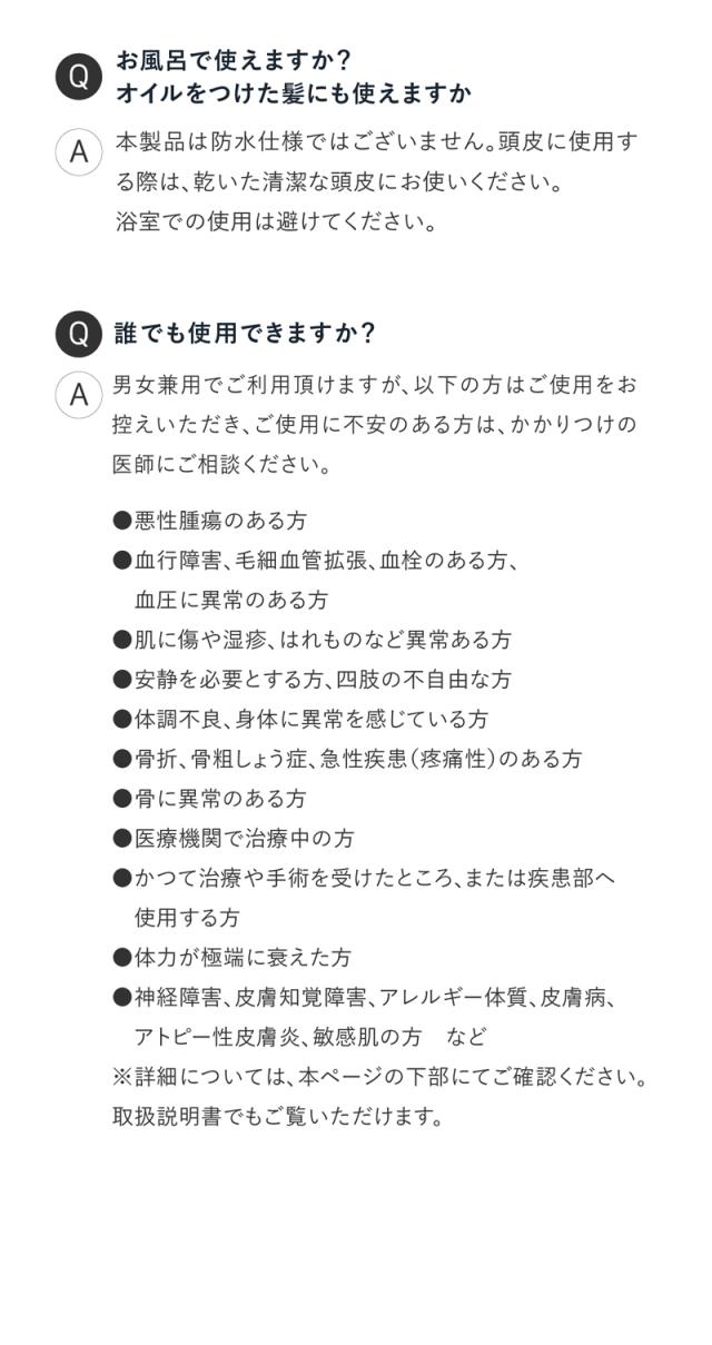 ●整形手術をした部位●美容医療手術直後●刺青(タトゥー)周辺 ●皮膚炎・過度の日焼けなど、皮膚に異常がある場合およびその部位 ●にきび・傷・湿疹・腫れもの・化膿性疾患のある場合およびその部位 ●かゆみやほてりのある部位 ●膨らんだほくろ・ウイルス性のイボ●のどぼとけ ●鼻・耳・唇 ●眼球・まぶた・目のまわり・首の前方●心臓付近