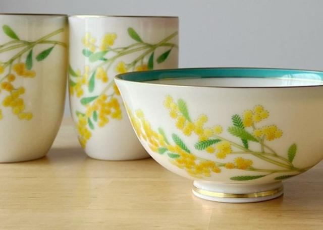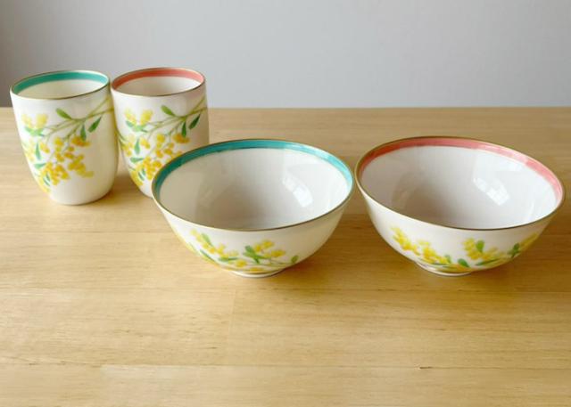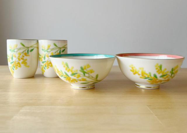 ミモザの代表的な花言葉は「感謝」 また、愛や幸福を呼ぶ花とも言われています。 結婚のお祝いや記念の贈り物に最適なお茶碗とお湯呑みの睦揃えです。