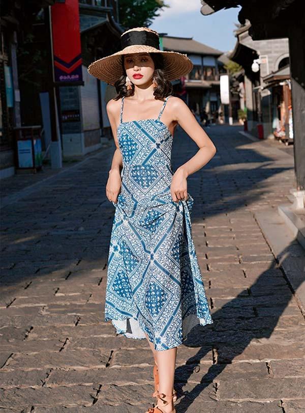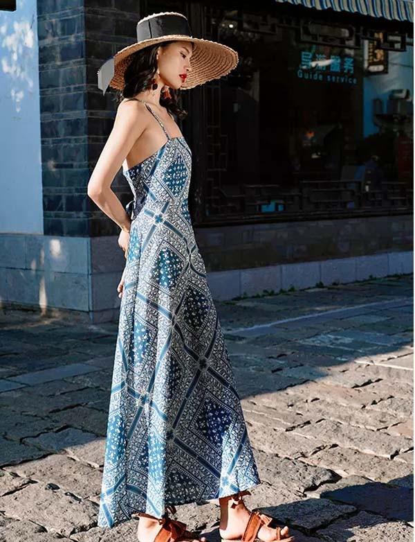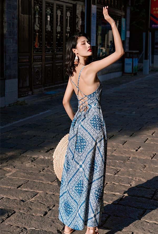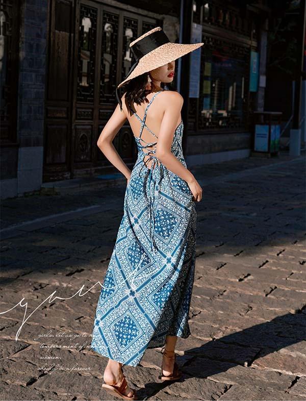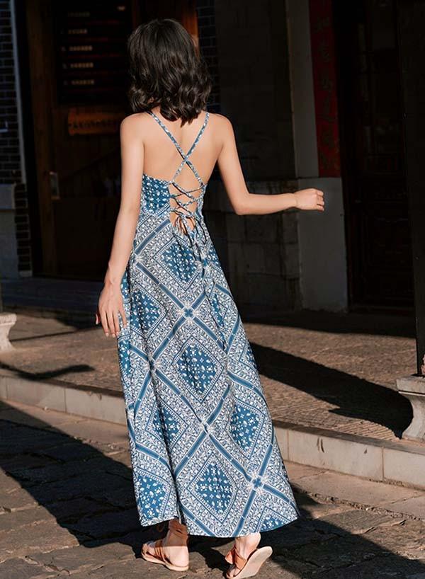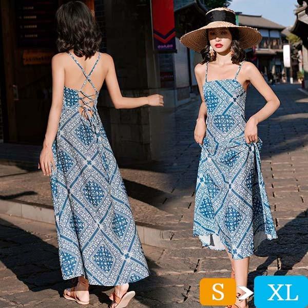 【レビュー投稿で+5%還元】ハワイ リゾートワンピース マキシ丈 ノースリーブ 背中開き 民族風 編み上げ 体型カバー 総柄 夏ワンピ ロングワンピース 沖縄 海外旅行 水色 レディース マキシワンピース おしゃれ 大人可愛い 細見え