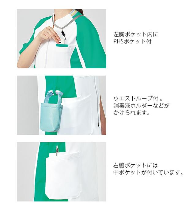 左胸ポケット(PHSポケット付)、両脇ポケット(右のみ中ポケット付)、ウエストループ付