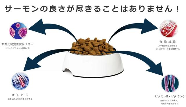 太平洋を回遊する天然のサーモンと、抗酸化作用や泌尿器系ケアの作用を持つポリフェノールを豊富に含むクランベリーや、ブルーベリーを使用したグレインフリーフード。オメガ 3 脂肪酸(EPA、DHA)を豊富に含む太平洋のサーモンを使用し、チキン、牛肉、ラム肉などのアレルギー対策にもなります。
