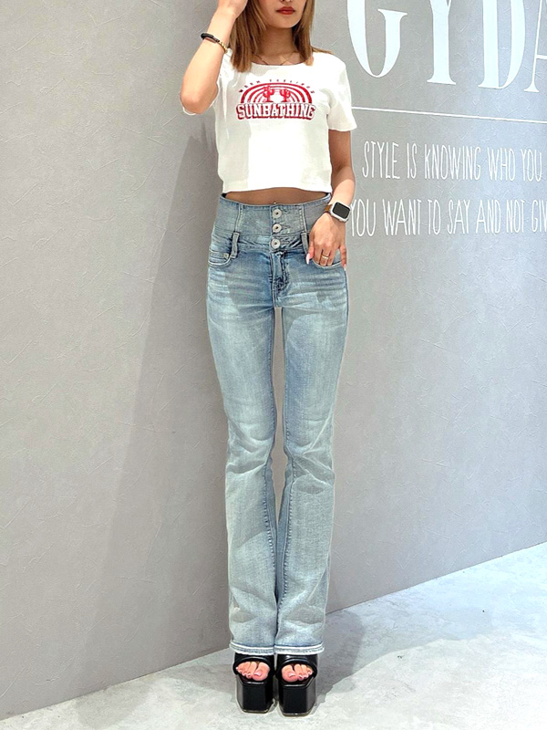 GYDA NEW High Waist BACK Cross Flare Pants ジェイダ NEW ハイウエスト バッククロス フレアパンツ 【GYDA(ジェイダ)】 西海岸LAのちょっとエッジィなスタイリング、空気感をイメージ。 オンナらしい体のラインは露出しつつ、下品にならないアイテム。 ミニマルなアイテムをシルエットや色でスタイリングして、エッジィさを出すLAのギャルのように、 セクシーだけどカジュアルな女の子のためのスタイリングを提案します。 バックのクロスデザイン肌みせが、後姿もSEXYなポイント。 ストレッチのデニム・カラー共に伸縮性に優れ穿きやすく◎ 膝部分まではタイトシルエットで、裾にかけてフレアシルエットも脚長効果抜群の1本。 後ろデザインの肌みせをして欲しいので、ショート丈合わせがおススメです。 | ||||||||||||||||||||||||||||