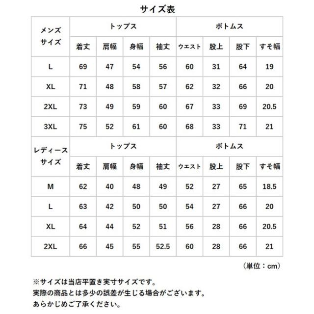 | サイズ | [メンズ] ・Lサイズ ・XLサイズ ・2XLサイズ ・3XLサイズ [レディース] ・Mサイズ ・Lサイズ ・XLサイズ ・2XLサイズ ※サイズについて詳細は、商品画像の中にあるサイズ表をご覧くださいませ。 |