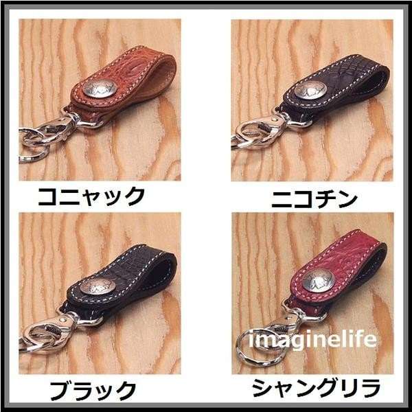 皮革部分にクロコダイル(ワニ皮)を使用したラウンド形のキーホルダーです。