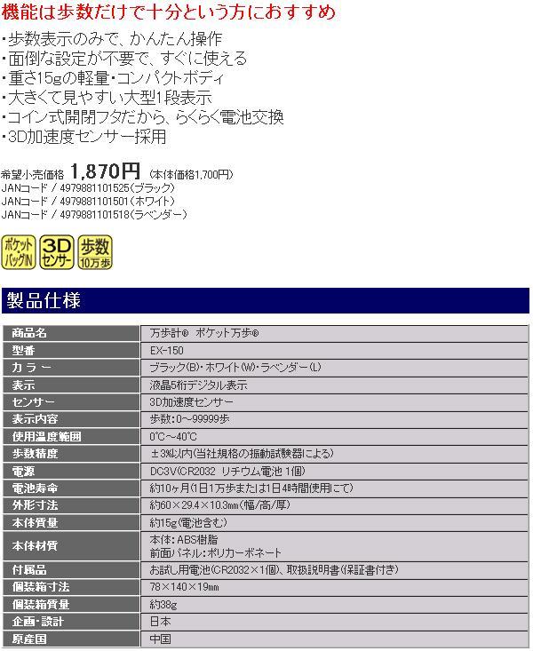 山佐時計計器 EX-150B 万歩計 ポケット万歩 ブラック EX150B【ネコポス対応1】【お取り寄せ商品】歩数計
