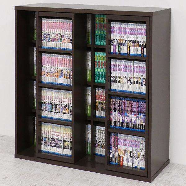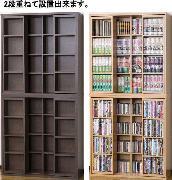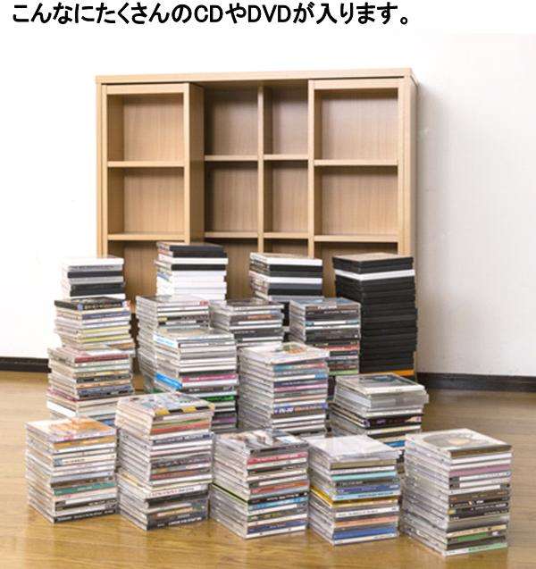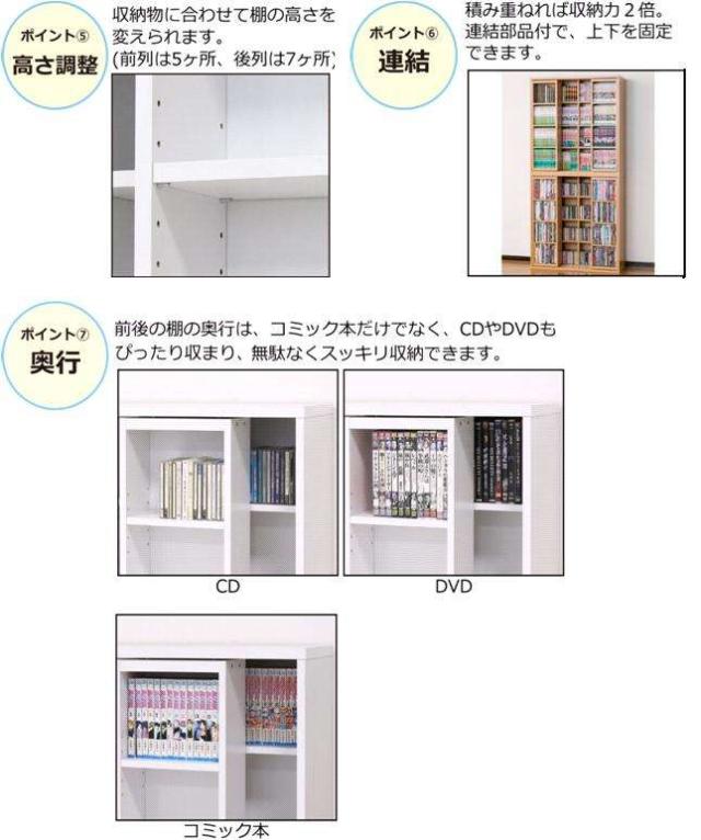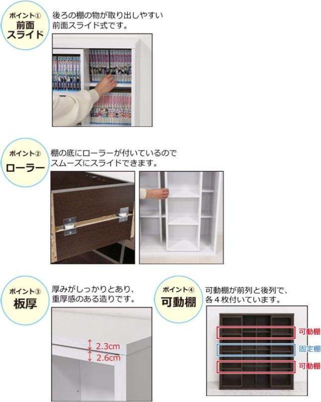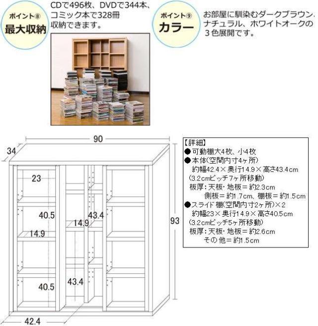 ◇奥の棚1列にCD41枚・DVD41枚・コミック本27冊、スライド棚1列ににCD21枚・DVD21枚・コミック本14冊、収納できます。