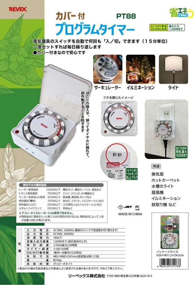 PT88 カバー付き プログラムタイマー リーベックス【お取り寄せ商品】【REVEX コンセント タイマー】