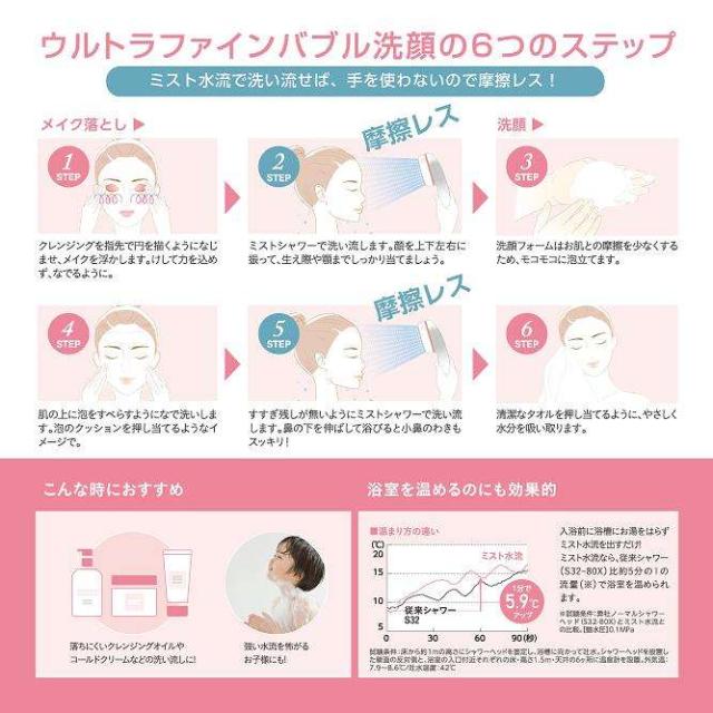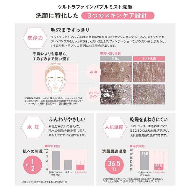 ・ミストシャワーは従来のシャワー(S32-80X)より水温が下がり、洗顔適温に。