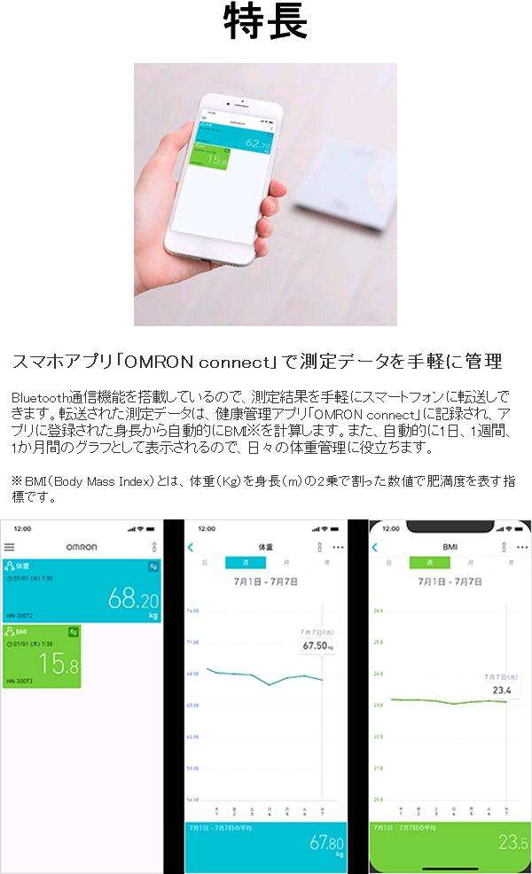 転送された測定データは、健康管理アプリ「OMRON connect」に記録され、アプリに登録された身長から自動的にBMI※を計算します。