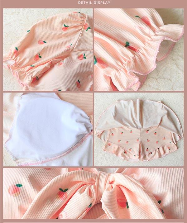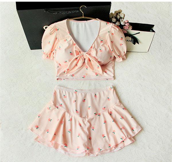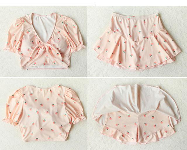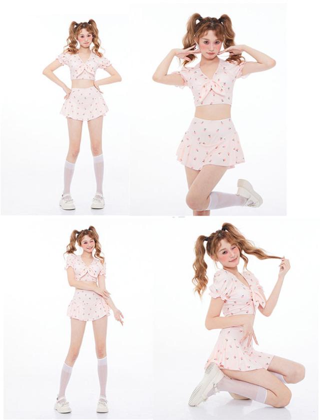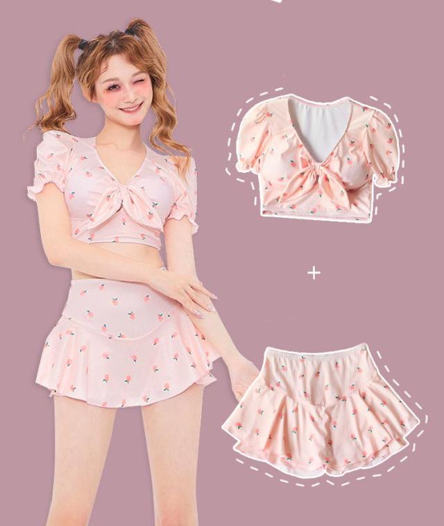 【レビュー投稿で+5%還元】水着もガーリースタイルにメイク♪水着 半袖トップス×スカートフリルガーリー桃柄セットアップビキニ m l 2l