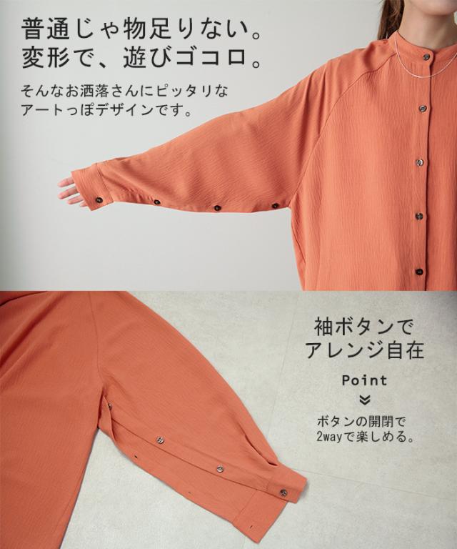 ケープ ケープシャツ バンドカラー ノーアイロン シンプル バンドカラーシャツ ノーカラーシャツ シンプルシャツ ゆったり ゆる シボ ドロップショルダー 袖コンシャス 袖コン 袖ボタン スリット袖 袖アレンジ スリット ワイドスリーブ スリットスリーブ スリットスリーブシャツ シースルー 透け感 ポワン ぽわん ロングシーズン チュニック丈 ロングスリーブ 長袖シャツ 長袖シアーシャツ シアーシャツ ボタンシャツ 前開きシャツ スリット入り サイドスリット サイドカット フレアシャツ 羽織り シワ シワになりにくい シワにならない アイロン不要 アイロンレス ドルマンスリーブ ドルマン袖 ドルマントップス ドルマンシャツ ドルマン 2WAY 2way レイヤードシャツ レイヤードブラウス トール丈 トール トールサイズ 高身長 170cm 長い 長め ゆったりサイズ ラクチン らくちん 楽ちん 楽 動きやすい お尻が隠れる 薄手 薄目 薄め 薄い こなれ アート アート性 個性 個性的 レイヤード 重ね着 重ね レイヤードコーデ 体型カバー アウター シャツワンピ シャツワンピース ワンピース 抜き襟 抜き襟シャツ 抜け感 こなれ こなれ感 華奢 華奢見え 通勤 ポワン袖 ぽわん袖 カフスボタン ラウンド ラウンド裾 ラウンド裾シャツ 前後差 大きいサイズ プラスサイズ ビッグ ビック big ビックシルエット ビッグシルエット ビックサイズ ビッグサイズ オーバーサイズ オーバー 着痩せ 大き目 大きい 大きめ フリーサイズ フリー S M L LL 2L XL 3L XXL LLL ランチ デート お出かけ アウトドア フェス リゾート ビーチ 海 旅行 飛行機 冷え性対策 冷房対策 冷え性予防 日焼け対策 カジュアル ナチュラル 大人カジュアル ベーシック オフィス オフィスカジュアル テレワーク リモートワーク リモート オンライン飲み会 おうち時間 お家時間 着回し 母の日 プレゼント ギフト 贈り物 クリスマス シンプル 大人 大人カジュアル オトナ 女性 綺麗 綺麗目 きれい キレイ キレイめ キレイメ きれいめ 高見え 上質 上品 レディースファッション 20代 30代 40代 50代 おしゃれ お洒落 オシャレ 可愛い かわいい カワイイ カッコいい 格好良い カッコイイ オレンジ サンセットオレンジ オレンジ色 橙 橙色 黒 黒色 ブラック 白色 白 ホワイト オフホワイト 春 夏 秋 冬 春夏 秋冬 HUG.U HUGU ハグユー はぐゆー