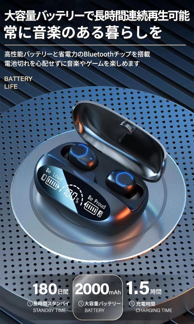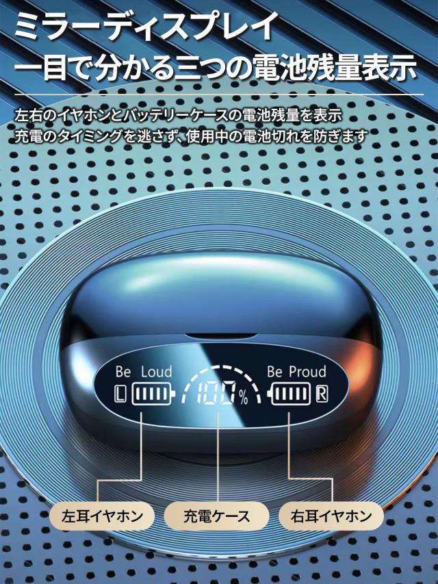 ミラーデジタルディスプレイだから電池残量がわかる(左右のイヤホンと充電ケース)使用中の電池切れを防ぐ