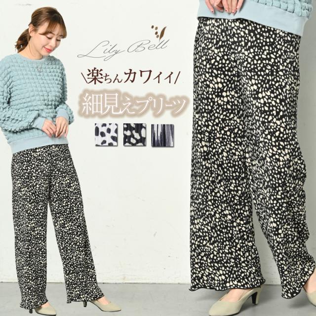 プリーツパンツ リブパンツ ワイドパンツ 柄 レディース パンツ ダルメシアン イージーパンツ ストレートパンツ 春 夏 秋 メロー ウエストゴム プリーツ ダルメシアン レオパード レオパード柄 ダルメシアン柄 M L