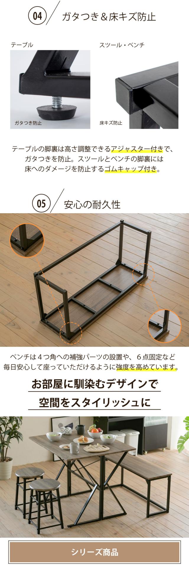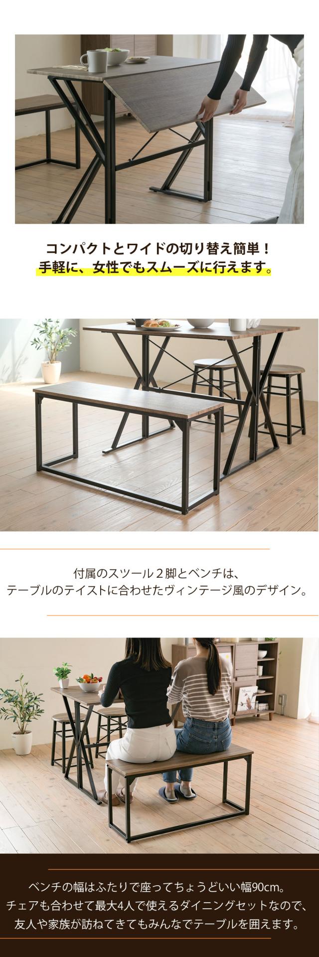 シーンに合わせて天板サイズを変えられるダイニングテーブルにイス2脚?2人掛けベンチが付いたダイニング4点セット。デスクとして使っても◎デスクとして使用するときはベンチがラックに、スツールがサイドテーブルに変身!