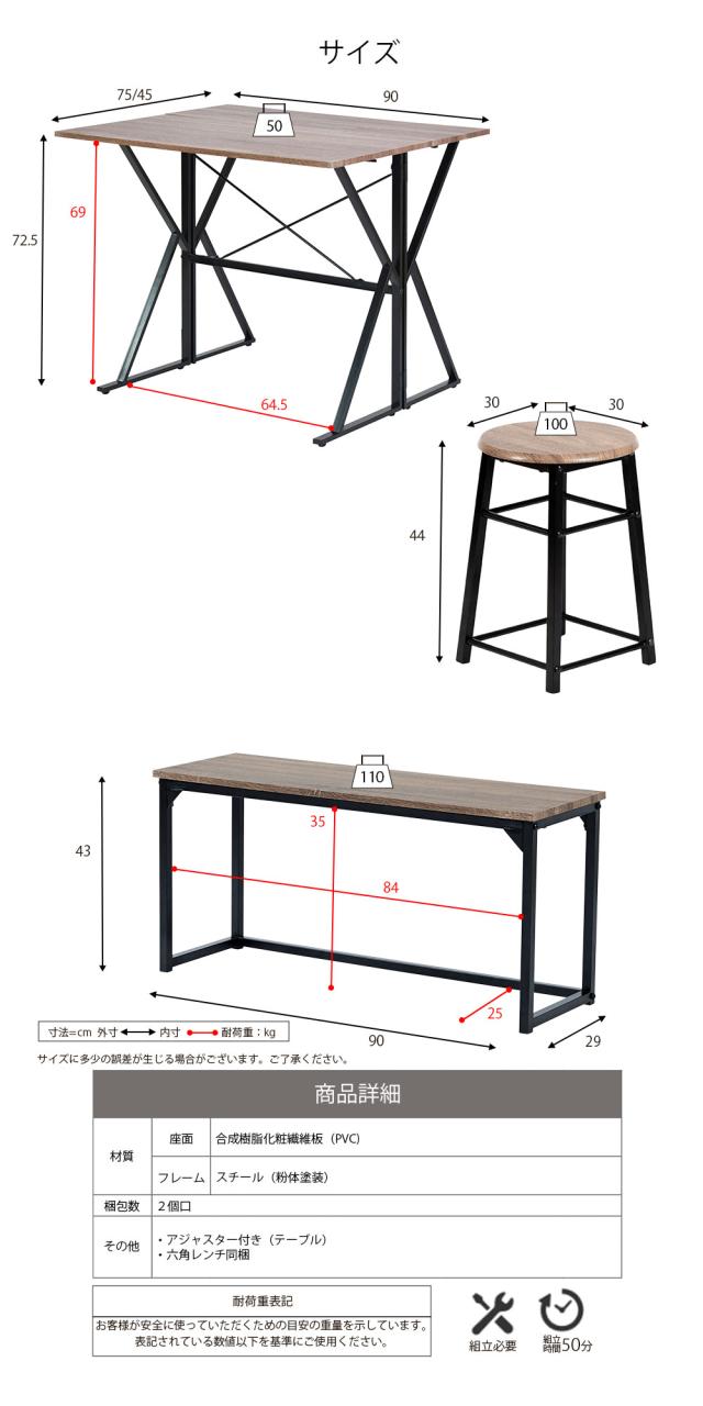 食卓テーブルセット 4点 折りたたみ テレワーク デスク 兼用 ダイニングテーブル コンパクト スツール ベンチ付き 90幅 新生活 引越し 家具 沖縄 離島別途送料見積もり メーカー直送品 UNI-0002SET