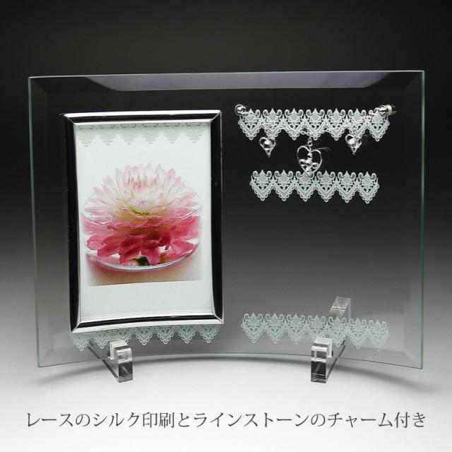 レースのシルク印刷とラインストーンのチャーム付きフォトフレームです。 | |