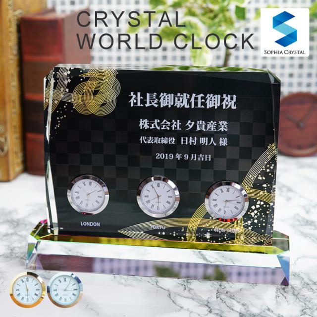 3つの時計部分にご希望の国名や都市名を入れることができるクリスタルガラス製の世界時計です