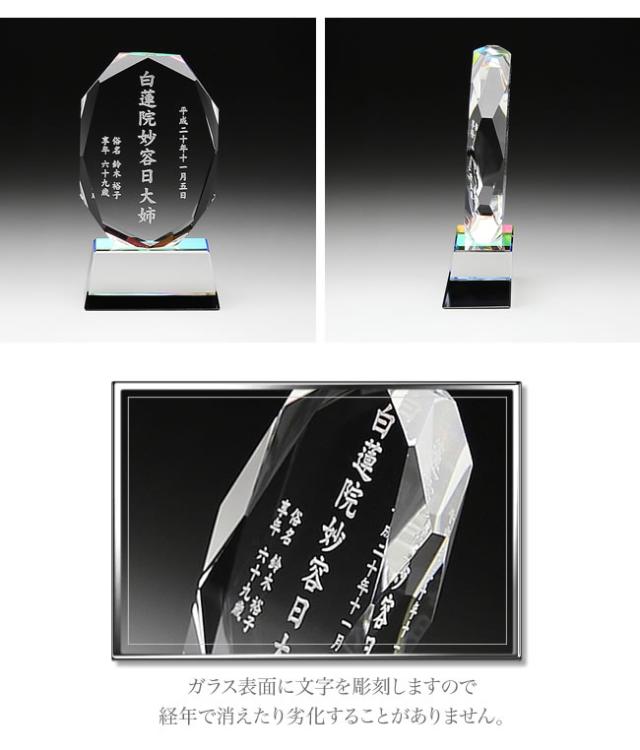 現代仏壇にマッチする美しいお位牌をお作りします。クリスタルガラスなので傷がつきにくく、変色など経年の劣化が非常に少なく美しさが持続します。 | |