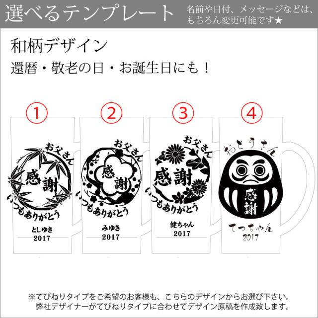 大人気の名入れギフト!ジョッキにメッセージを彫刻します。父の日、敬老の日、誕生日祝い、還暦祝い…どんなお祝いにも喜ばれるビールジョッキです。 | |