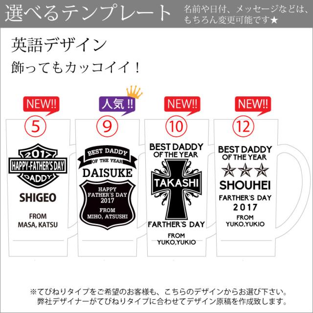 デザインテンプレートで簡単にオリジナルビールジョッキを作ることができます。選べるテンプレートデザインは15種類! ビールジョッキにお相手の名前を彫刻することで、特別感のあるプレゼントとして人気です!