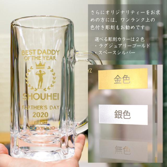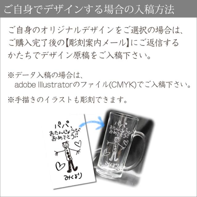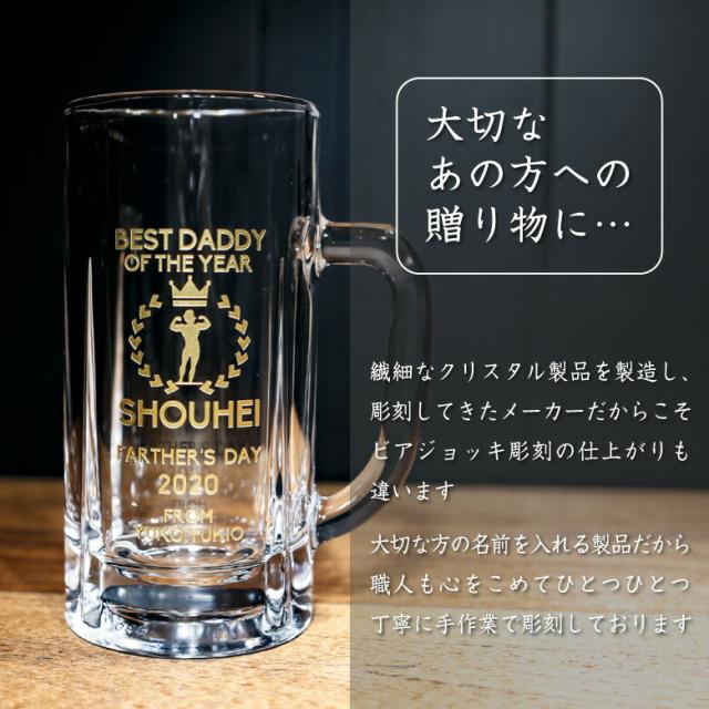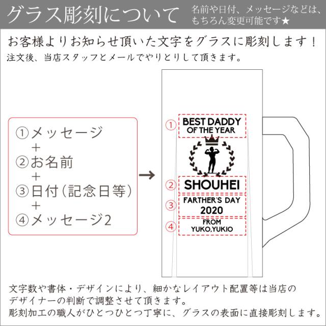 大人気の名入れギフト!ジョッキにメッセージを彫刻します。父の日、敬老の日、母の日、結婚祝い、結婚記念、誕生日祝い、金婚祝い、還暦祝い…どんなお祝いにも喜ばれるビールジョッキです。 | |