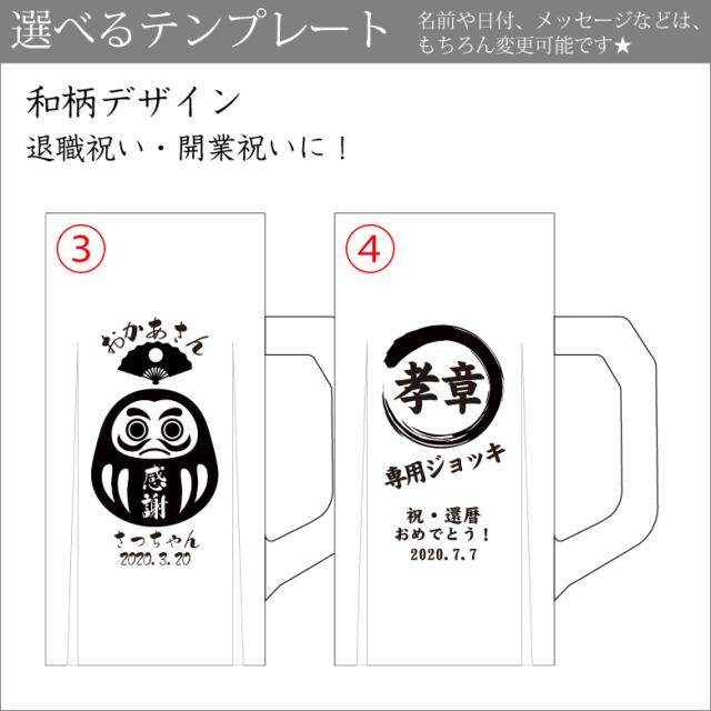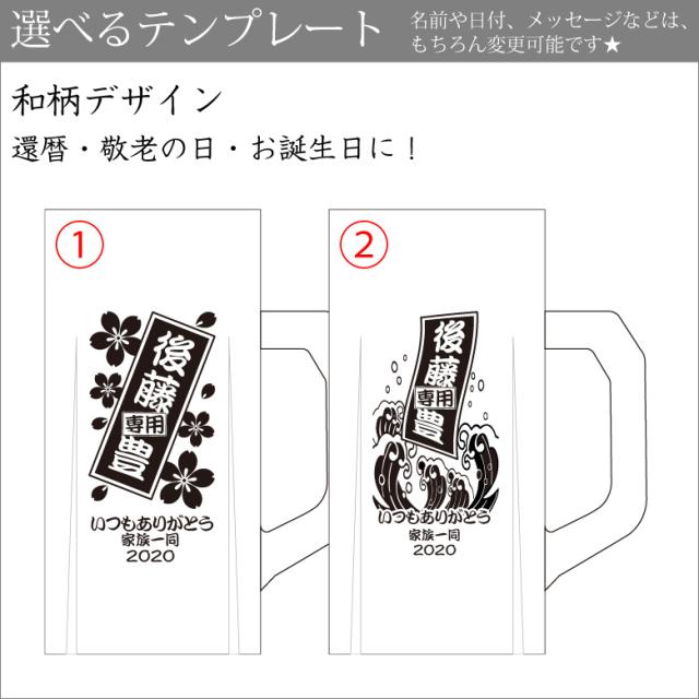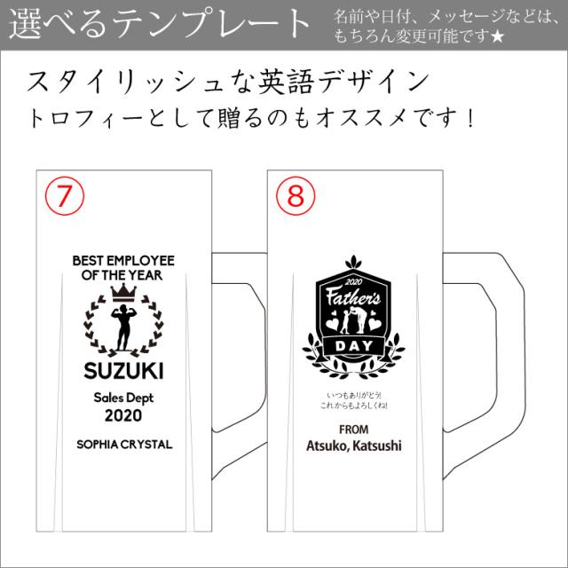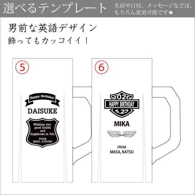 この商品は、デザインテンプレートで簡単にオリジナルビールジョッキを作ることができます。選べるテンプレートデザインは8種類! ビールジョッキにお相手の名前を彫刻することで、特別感のあるプレゼントとして人気です!