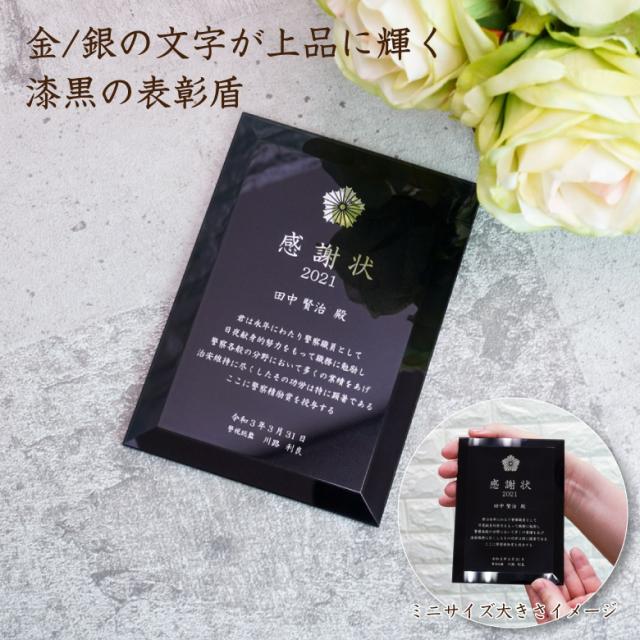 金/銀の文字と美しいデザインが上品に輝く、漆黒の表彰盾です。