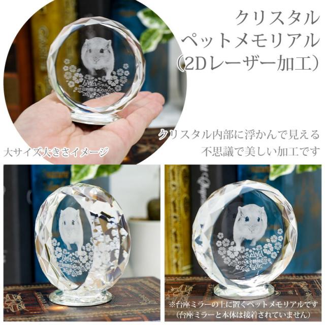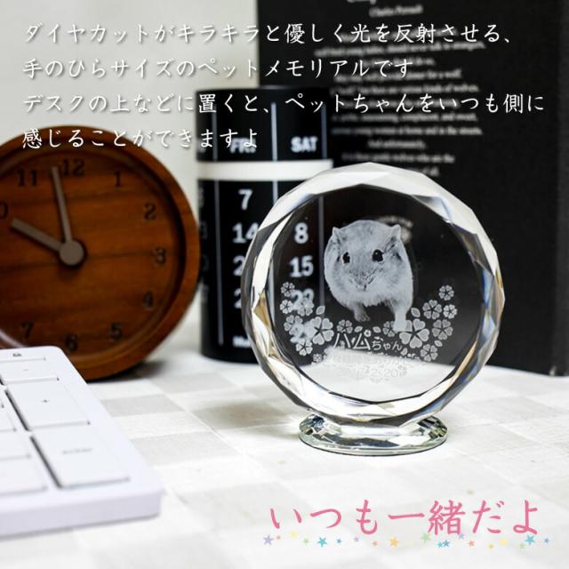 説 明 | ダイヤカットがキラキラと優しく光を反射させる、手のひらサイズのクリスタルペットメモリアルです。ころんとした丸みのあるクリスタルに、ペットちゃんのお写真を2Dレーザー彫刻いたします。台座にはミラーを使用しているので、さらにキラキラと美しく輝きます。ガラスの透明感、カットの美しさなどご満足いただけるはずです! |