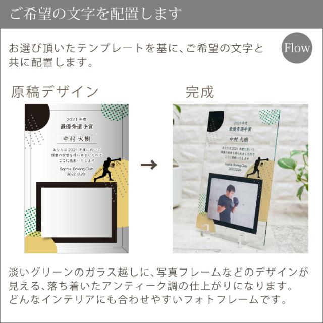 淡いグリーンのガラス越しに背景デザインが見える、スポーツガラスフォトフレームです。派手になりすぎず落ち着いた仕上がりは、どんなインテリアにも合わせることができます。